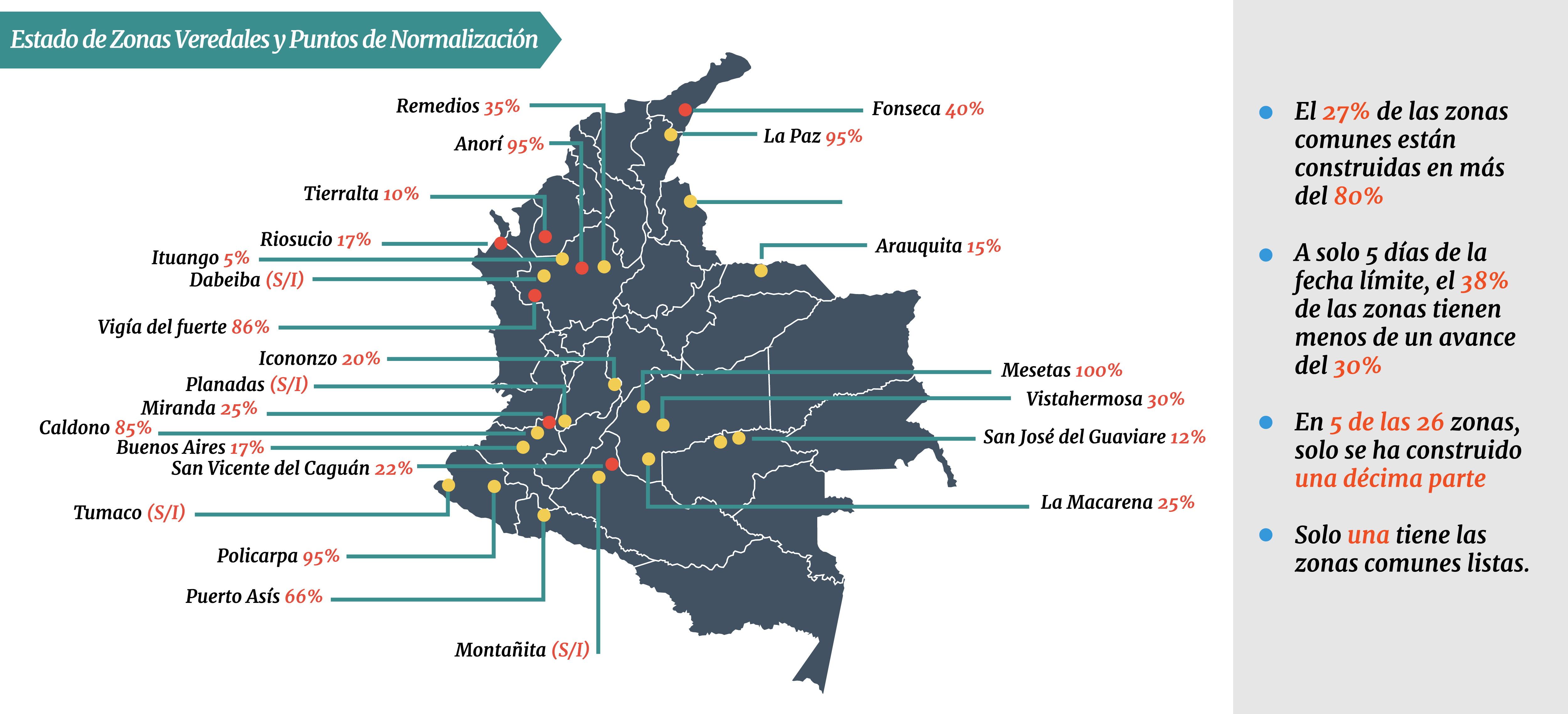 Al respecto, Córdoba sostuvo que en 16 zonas “están o comenzando adecuación de terreno que es como 5 por ciento y avances del 70 por ciento de zonas comunes”. Esto sin contar que en la región del Catatumbo, Norte de Santander, ni siquiera está en firme la ubicación del campamento.