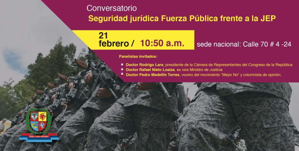 “ Seguridad jurídica Fuerza Pública frente a la JEP ” Que se realizará el próximo miércoles 21 de febrero, a las 10:50 horas en la sede nacional ubicada en la calle 70 No. 4-24. Panelistas invitados:
