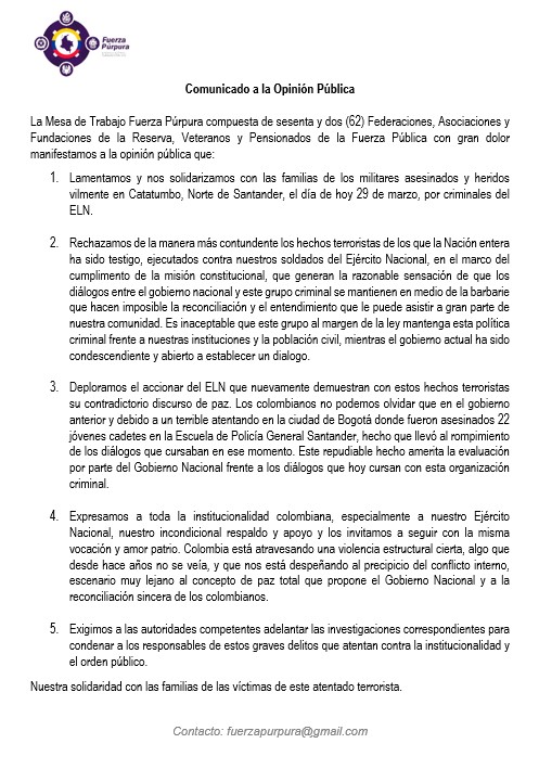 Comunicado de Fuerza Púrpura sobre el ataque terrorista perpetuado por el ELN en Norte de Santander.