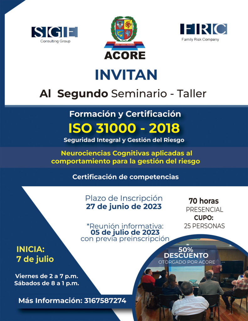 Los invitamos al segundo seminario taller (Formación y Certificación) ISO 31000 – 2018 Seguridad Integral y Gestión del Riesgo Neurociencias Cognitivas aplicadas al comportamiento para la gestión del riesgo.