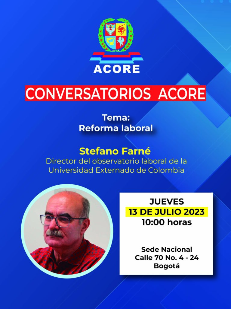 Conversatorio sobre reforma Laboral, con el panelista Stefano Farné, en la Sede Nacional ACORE, Calle 70 No. 4 -24 el jueves 13 de julio a las 10:00 a.m.