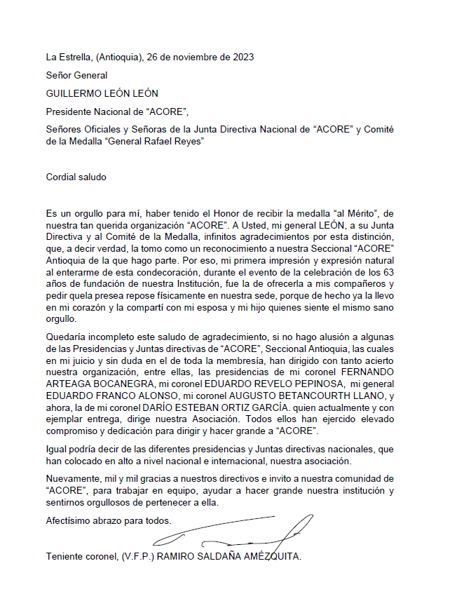 Compartimos la carta de agradecimiento del señor Teniente Coronel (V.F.P.) RAMIRO SALDAÑA AMÉZQUITA.