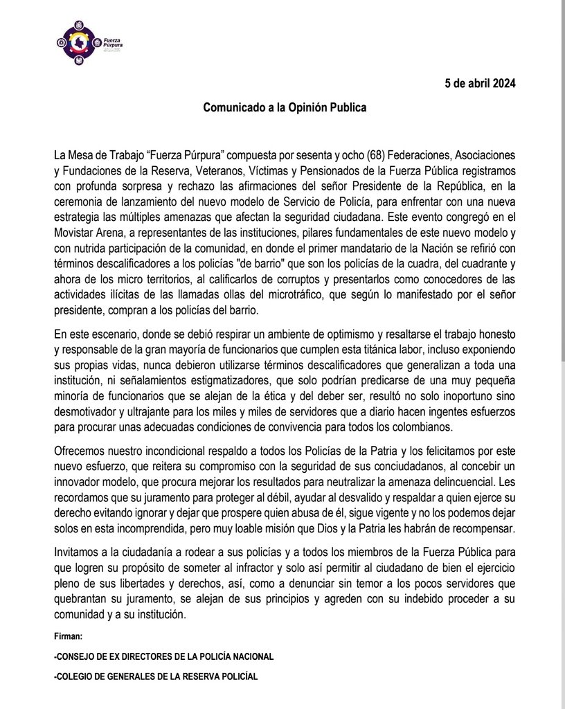 Rechazamos afirmaciones del Presidente Gustavo Petro donde utilizó términos descalificadores que generaliza y estigmatiza a toda una institución, Policía Nacional de Colombia. Invitamos a los colombianos a rodear a sus policías y a todos los miembros de Fuerza Pública.