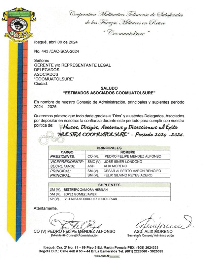 Queremos felicitar a nuestro Asociado el Señor CR (R) Pedro Felipe Méndez Alfonso, quién fue elegido como Presidente del Consejo Directivo por un periodo de dos años de la Cooperativa Multiactiva de Suboficiales de las FF.MM. en retiro COOMUATOLSURE.