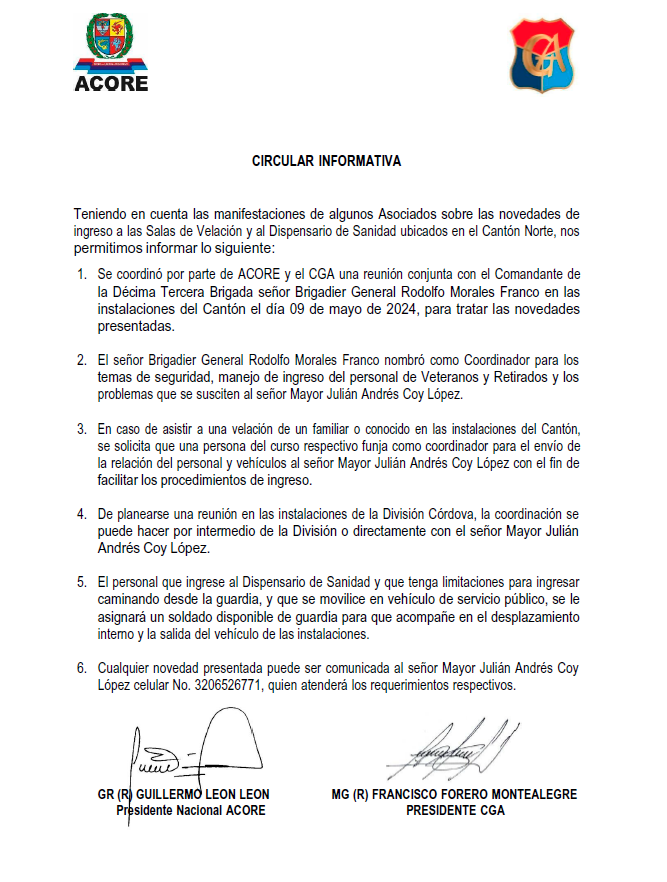 Tras reunión efectuada con el Comandante de la Décima Tercera Brigada señor Brigadier General Rodolfo Morales Franco y teniendo en cuenta las manifestaciones de algunos Asociados sobre las novedades de ingreso a las Salas de Velación y al Dispensario de Sanidad ubicados en el Cantón Norte, nos permitimos compartir esta circular informativa.