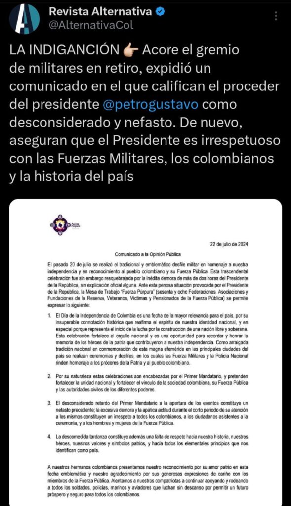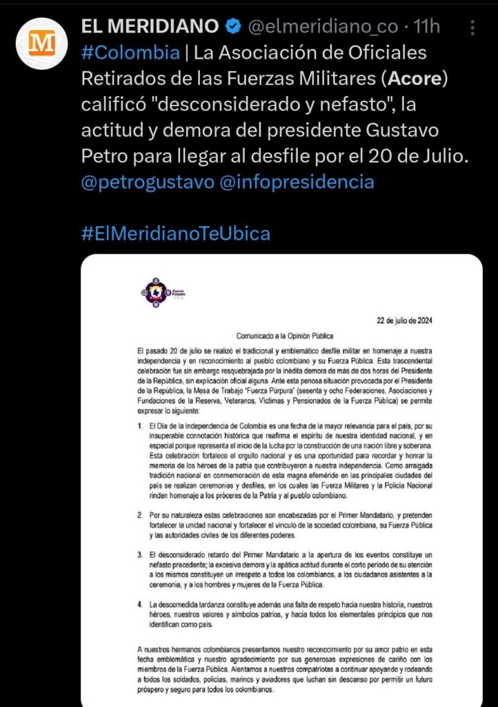 Nos permitimos compartir comunicado de Fuerza Púrpura sobre la demora del presidente Gustavo Petro en el desfile del pasado 20 de julio: