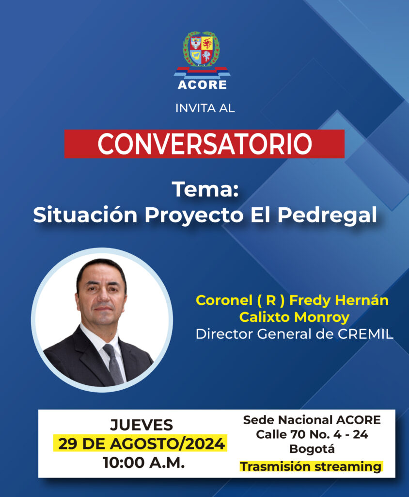 Conversatorio con el Coronel (R) Fredy Hernán Calixto Monroy –  Director General de CREMIL el próximo jueves 29 de agosto de 2024 en la Sede Nacional de ACORE Calle 70 No.4 -24 Bogotá, en el que expondrá la situación del Proyecto El Pedregal.