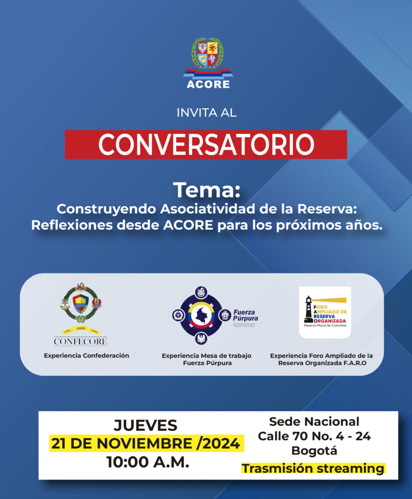 En el marco de la semana conmemorativa de nuestro Aniversario 64 Nos permitimos invitarlos a nuestro conversatorio Construyendo Asociatividad de la Reserva: Reflexiones desde ACORE para los próximos años que se llevará a cabo el próximo jueves 21 de noviembre a las 10:00 a.m. en la Sede Nacional ACORE, calle 70 # 4 -24 Bogotá.