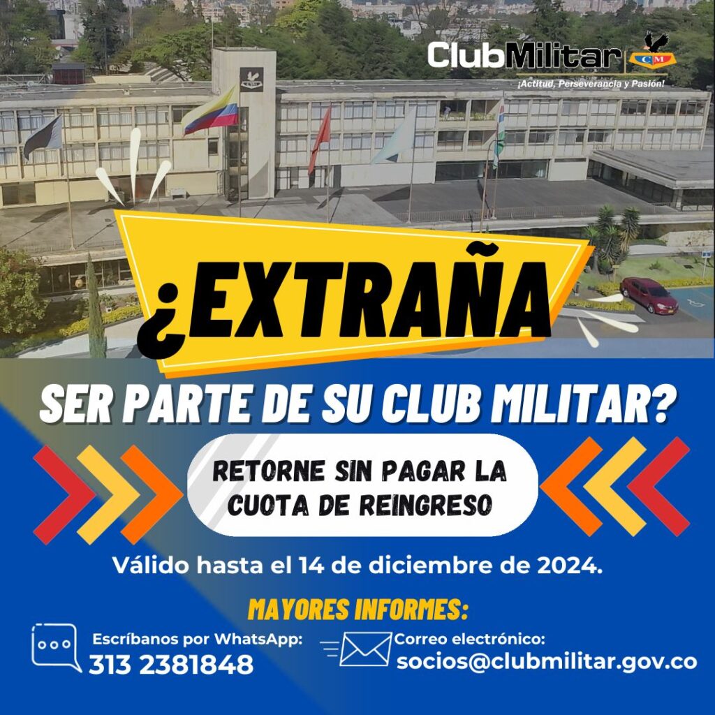 Compartimos la invitación del Club Militar a retornar como socios sin pagar la cuota de reingreso, esta gran oportunidad y amnistía valida hasta el 14 de diciembre de 2024.