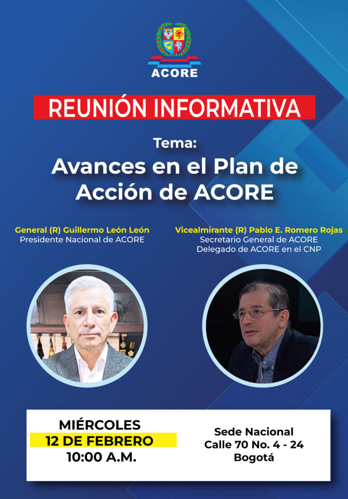 Nos permitimos invitar a todos nuestros Asociados a una Reunión informativa sobre los avances en el Plan de Acción de ACORE. Las presentaciones y explicaciones estarán a cargo del Señor General (R) Guillermo León León, Presidente Nacional de ACORE y del Señor Vicealmirante (R) Pablo Emilio Romero Rojas, Secretario General de ACORE.