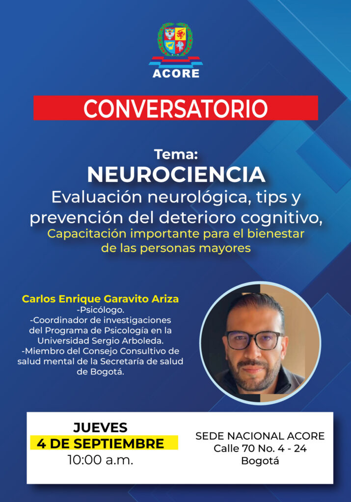ACORE invita cordialmente a participar en el Conversatorio: Neurociencia – Evaluación neurológica, tips y prevención del deterioro cognitivo, una capacitación importante para el bienestar de las personas mayores.