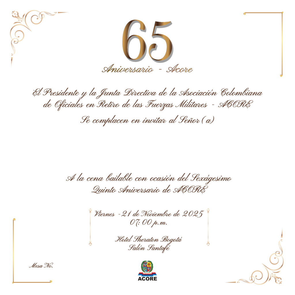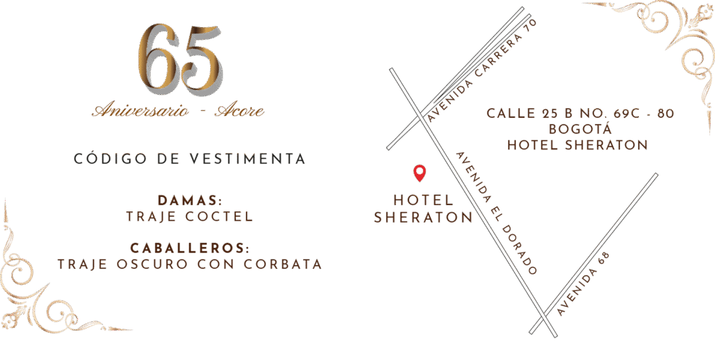 La Junta Directiva Nacional y la Presidencia de ACORE tienen el honor de invitarles a la tradicional Cena de Aniversario, con motivo de la celebración de nuestro Sexagésimo Quinto Aniversario, que en esta ocasión se llevará a cabo en el Hotel Sheraton de Bogotá.