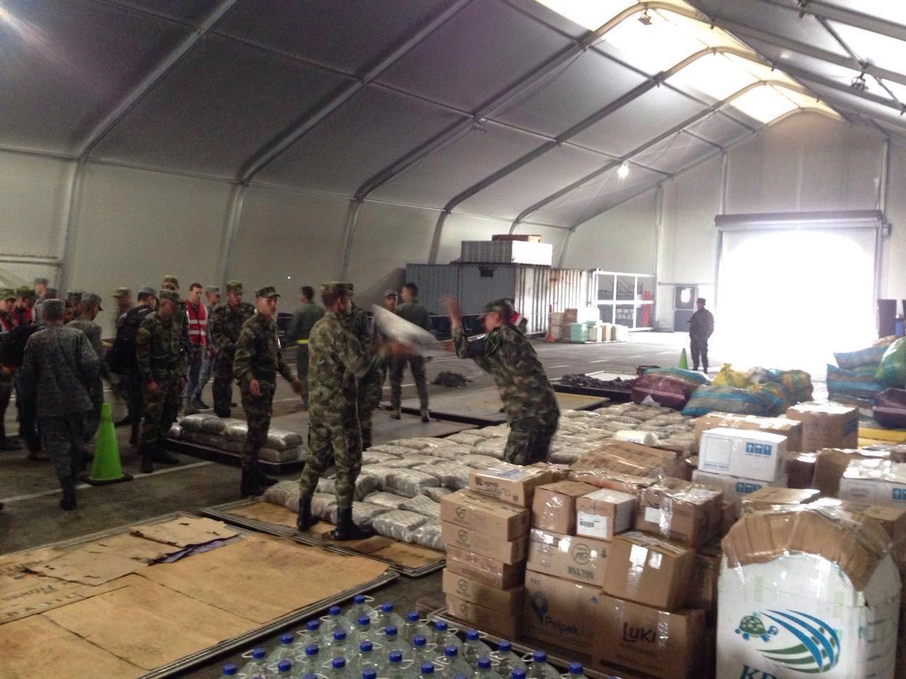 En un avión Boeing 767 «Júpiter» se abordaron las 23 toneladas de alimentos, agua, ropa, calzado, frazadas, pañales desechables y medicamentos, gestionados por el Cuerpo de Profesionales Oficiales de la Reserva del Ejército Nacional y empresarios de Corabastos.