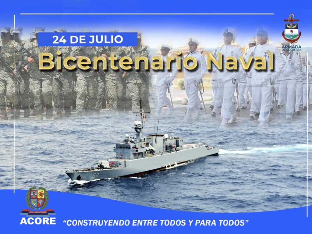 En el Bicentenario Naval saludamos a los hombres y mujeres de nuestra Armada de Colombia. Como colombianos nos sentimos seguros en su protección de los ríos y mares, contribuyendo así a la defensa de nuestra soberanía. ¡Gratitud eterna! «ACORE, CONSTRUYENDO ENTRE TODOS Y PARA TODOS»