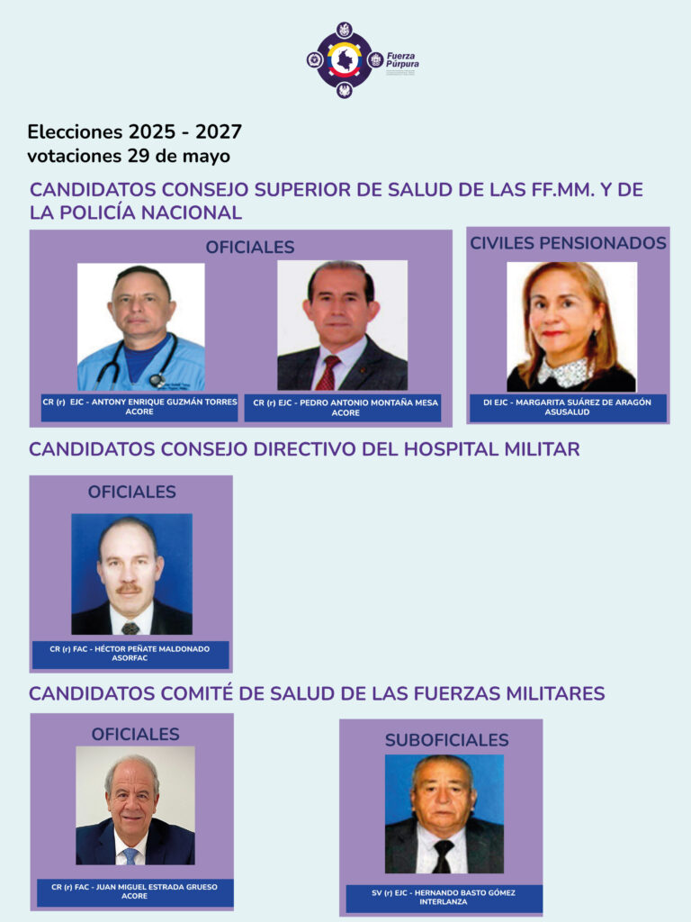 Compartimo los candidatos por Fuerza púrpura para las elecciones virtuales al Sistema de Salud de las Fuerzas Militares y la Policía Nacional, que se llevarán a cabo el 29 de mayo desde las 8:00 AM hasta las 4:00 PM Compartimos paso a paso para Votar en el Sistema de Salud de las FF.MM