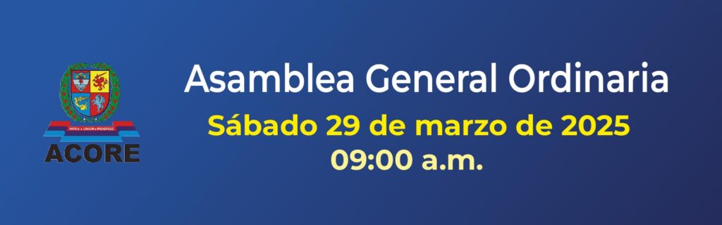 ¡ATENCIÓN – MUY IMPORTANTE! CONVOCATORIA FORMAL A ASAMBLEA GENERAL ORDINARIA ACORE 2025 Señores y señoras Asociados: Nos permitimos informar a nuestros Asociados que cumpliendo los lineamientos estatutarios de ACORE, artículos 38 y 39, la Junta Directiva Nacional se permite convocar a Asamblea General Ordinaria 2025, a efectuarse el próximo día sábado 29 de marzo de 2025, a partir […]