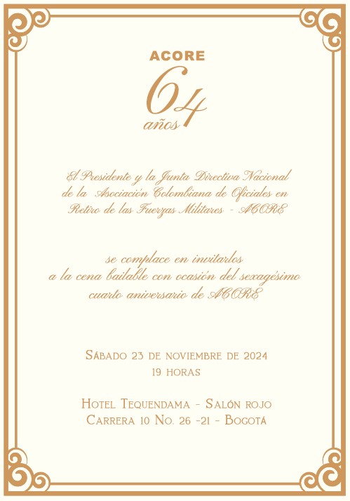 La Presidencia Nacional y la Junta Directiva de ACORE se permiten invitar a nuestros Asociados a agendar desde ya su asistencia a nuestra tradicional «Cena Bailable Aniversario de ACORE». Fecha: sábado 23 de Noviembre de 2024 Lugar: Hotel Tequendama – Salón Rojo Hora: 7 p.m. Damas: Traje de Cóctel Caballeros: Traje oscuro con corbata Entrega personalizada de tarjetas a partir del […]