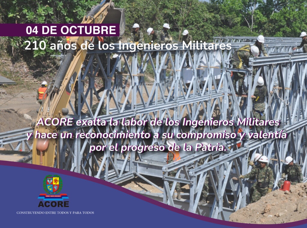 Desde ACORE conmemoramos 210 años de nuestros Ingenieros Militares.Su lema Vencer o Morir junto con el sacrificio y dedicación son símbolos de progreso para Colombia. Los alentamos para que continúen siendo el motor que impulsa el desarrollo de nuestro país. ACORE, CONSTRUYENDO ENTRE TODOS Y PARA TODOS