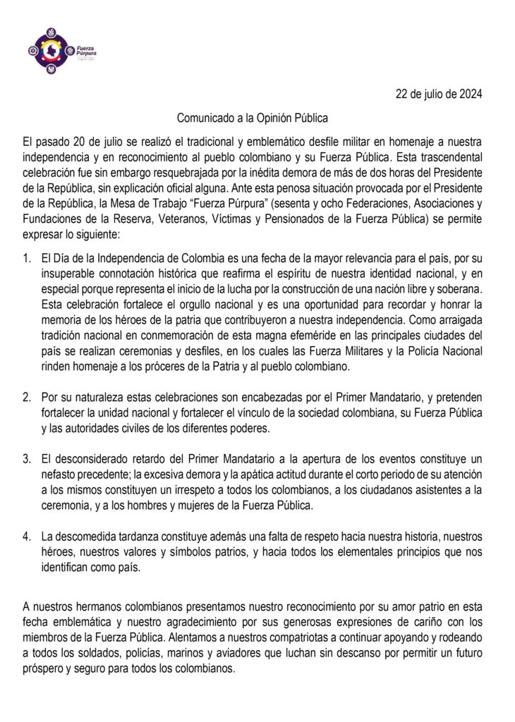 Nos permitimos compartir comunicado de Fuerza Púrpura sobre la demora del presidente Gustavo Petro en el desfile del pasado 20 de julio: Desconsiderado retardo del Primer Mandatario constituye un nefasto precedente; la excesiva demora y apática actitud durante el corto periodo de su atención a los mismos constituyen un irrespeto a todos los colombianos. https://www.semana.com/nacion/articulo/veteranos-de-la-fuerza-publica-arremeten-contra-el-presidente-petro-por-su-retraso-en-desfile-del-20-de-julio-irrespeto/202402 […]