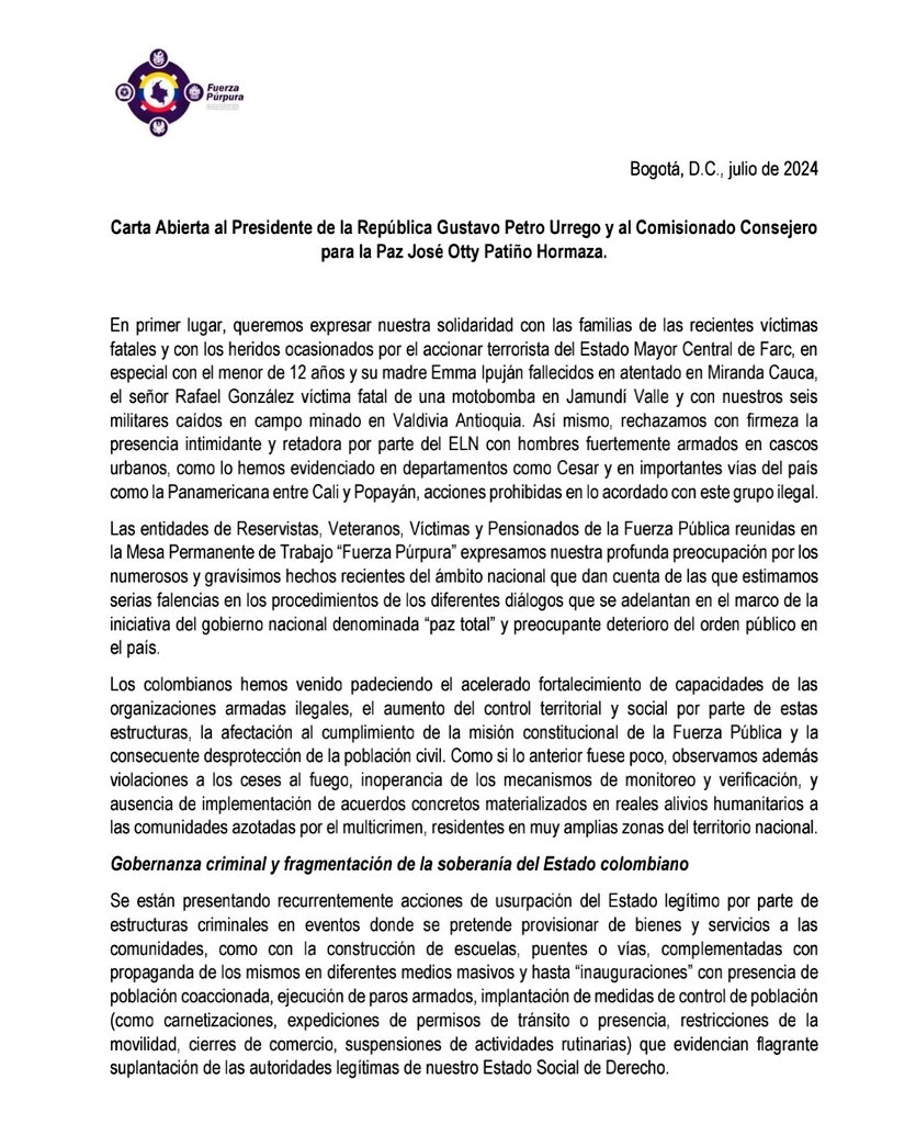 Presentamos ante el presidente Gustavo Petro nuestra profunda preocupación frente a serias falencias en el marco de la «Paz Total» y el deterioro del orden público en el país. Desde la Reserva hacemos un llamado frente a la situación humanitaria en las regiones.