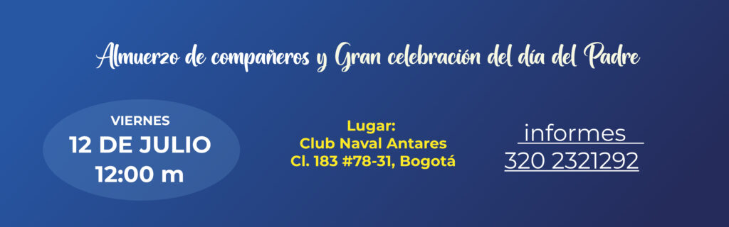 Gran celebración día del Padre Teléfono para reservas: 320 2321292 Departamento de socios Viernes 12 de julio de 2024 a las 12:00 m Plazo para inscripciones: 08 de julio de 2024Lugar: Club Naval AntaresCl. 183 #78-31, Bogotá $25.000 Precio individual por Asociado, para pareja de Asociado, o hijo de Asociado.