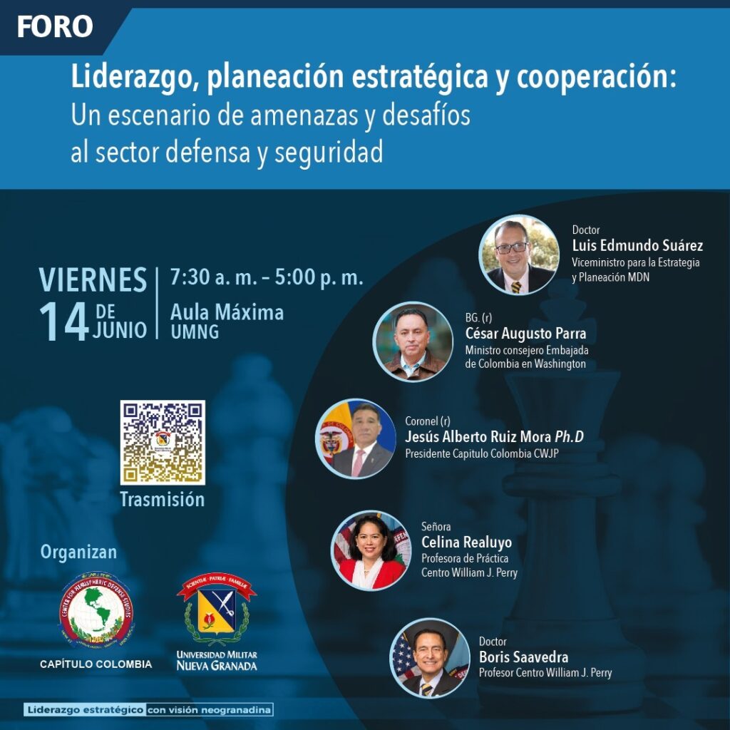 Compartimos el enlace del Foro «Liderazgo, planeación estratégica y cooperación» Escenario de amenazas al sector de defensa y seguridad que se realizó el viernes 14 de junio de 7:30 a.m. a 5:00 p.m. en el Aula máxima de la Universidad Militar Nueva Granada.