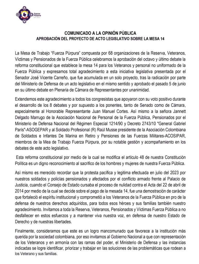 Nos permitimos compartir comunicado de Fuerza Púrpura sobre la aprobación del Acto Legislativo relativo a la Mesada 14