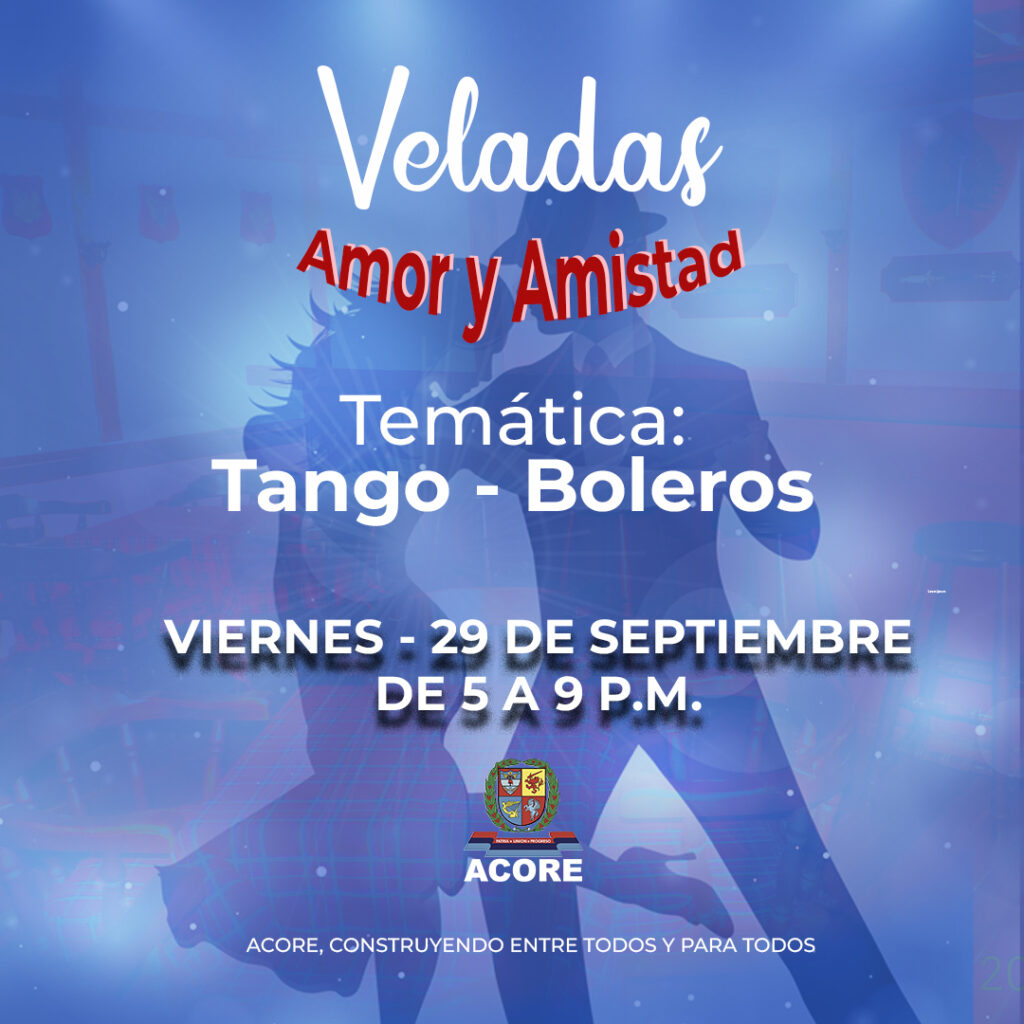 Los esperamos el próximo viernes 29 de septiembre en nuestra segunda edición de las “Veladas ACORE”, para celebrar el mes de Amor y Amistad, donde compartiremos un grato espacio de amistad y podremos recordar lo mejor de los boleros y tangos.Recuerden reservar su mesa con el Departamento de Socios en el celular 320 2321292.