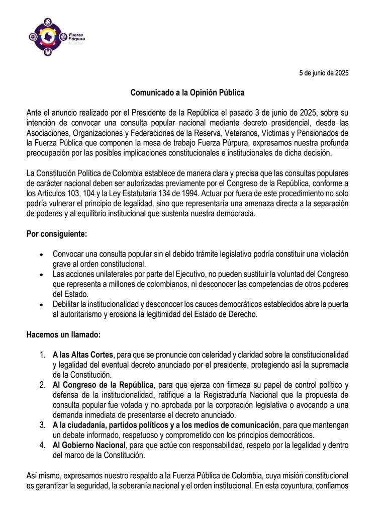 La Mesa de Trabajo Fuerza Púrpura, compuesta por 75 Asociaciones, Organizaciones, Fundaciones, Federaciones de la Reserva, Veteranos, Víctimas y Pensionado de la Fuerza Pública de Colombia, expresa su más profundo pesar por el fallecimiento del senador y precandidato presidencial Miguel Uribe Turbay, ocurrido el 11 de agosto de 2025, como consecuencia del cobarde atentado perpetrado […]