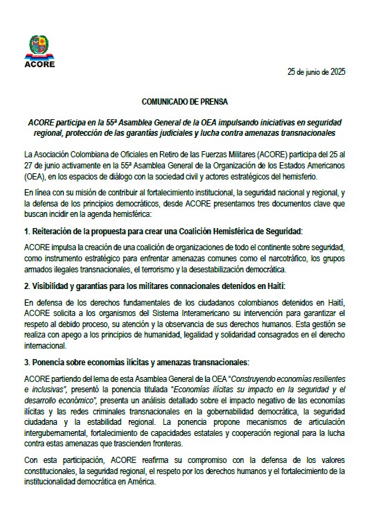ACORE presente en la 55ª Asamblea General de la OEA Del 25 al 27 de junio de 2025, estamos participando activamente en este importante escenario hemisférico presentando propuestas clave en materia de seguridad regional, defensa de los derechos humanos y lucha contra amenazas transnacionales.
