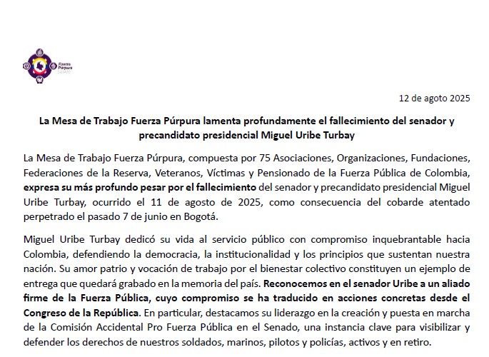 La Mesa de Trabajo Fuerza Púrpura lamenta profundamente el fallecimiento del senador y precandidato presidencial Miguel Uribe Turbay