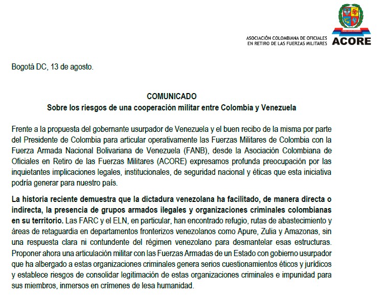 Comunicado sobre los riesgos de una cooperación militar entre Colombia y Venezuela