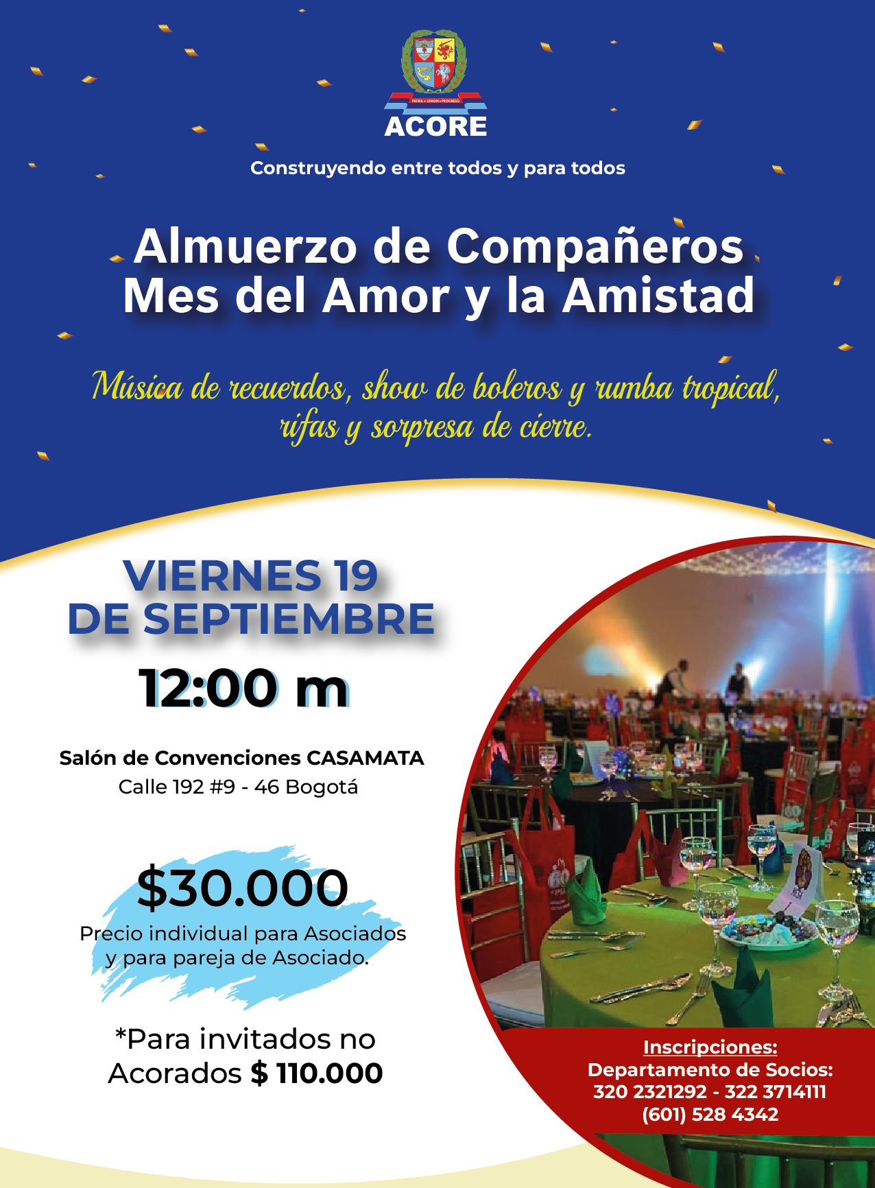 ACORE se complace en invitarlo al Almuerzo de Compañeros Mes del Amor y la Amistad Fecha: Viernes 19 de septiembre, 12:00 mLugar: Casamata – Calle …